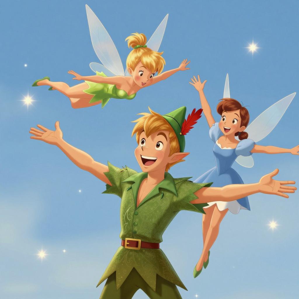 Digital illustration of Peter Pan and Tinker Bell flying above a blue sky. Peter Pan, wearing a green tunic and hat, leads with an outstretched arm. Tinker Bell follows, sparkling with fairy dust. A pirate ship with glowing sails is in the background. A tall, brown clock tower is on the left. Peter Pan smiles, Tinker Bell has a determined expression. Both are mid-air, surrounded by sparkling fairy dust.