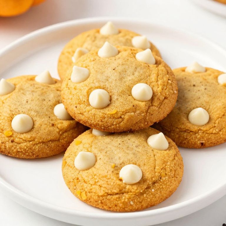 Golden pumpkin cookies with white chocolate chips and cinnamon specks are artfully stacked on a pristine white plate, showcasing their warm, inviting texture and delightful blend of flavors.