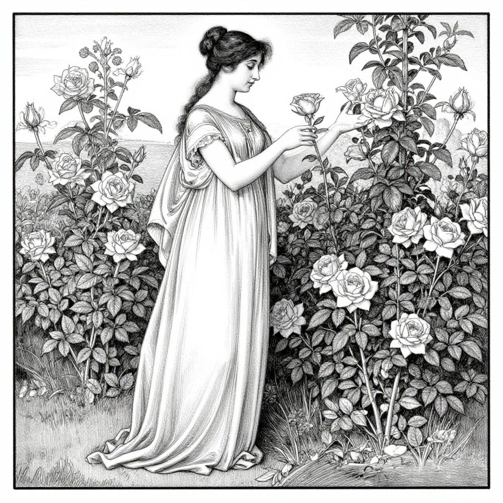 A delicate black-and-white illustration inspired by Dante Gabriel Rossetti's style, featuring a woman in a flowing gown gracefully interacting with a garden of blooming roses, rendered with intricate linework and a vintage aesthetic.