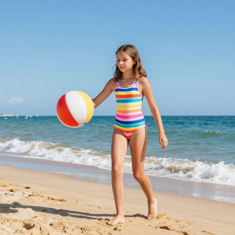 14 year old girl beach scene, sunlit golden sands, wearing a colorful swimsuit, playing with a beach ball near gentle waves, vibrant summer atmosphere, clear blue sky, photorealistic style