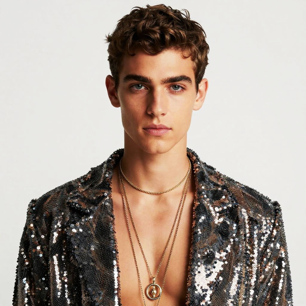 Professional photographic portrait of an attractive young male ballet dancer wearing a sleek black tank top and a black wrist wrap. The dancer has a slim build, light skin tone, and light brown hair styled with a slight wave. The background is plain white, emphasizing the dancer's form and attire. Captured in high resolution with a focus on symmetry and sharp details.