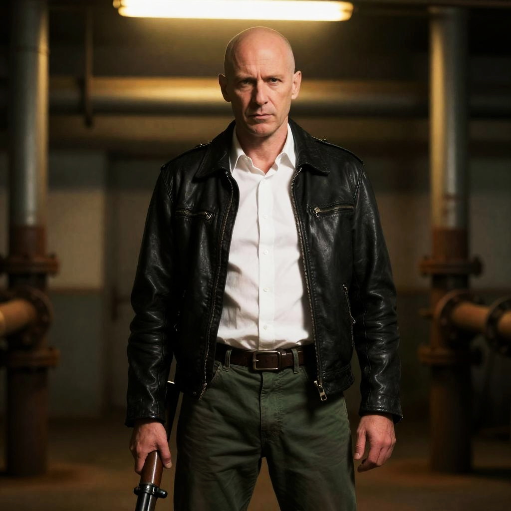 Photograph of an older, bald man with a grizzled face, wearing a dirty gray shirt and dark apron, standing in a dimly lit, brick-walled blacksmith's workshop. He holds out both hands, illuminated by a bright orange flame in the background. A wooden table with tools is on the left. Intense expression. Single person.