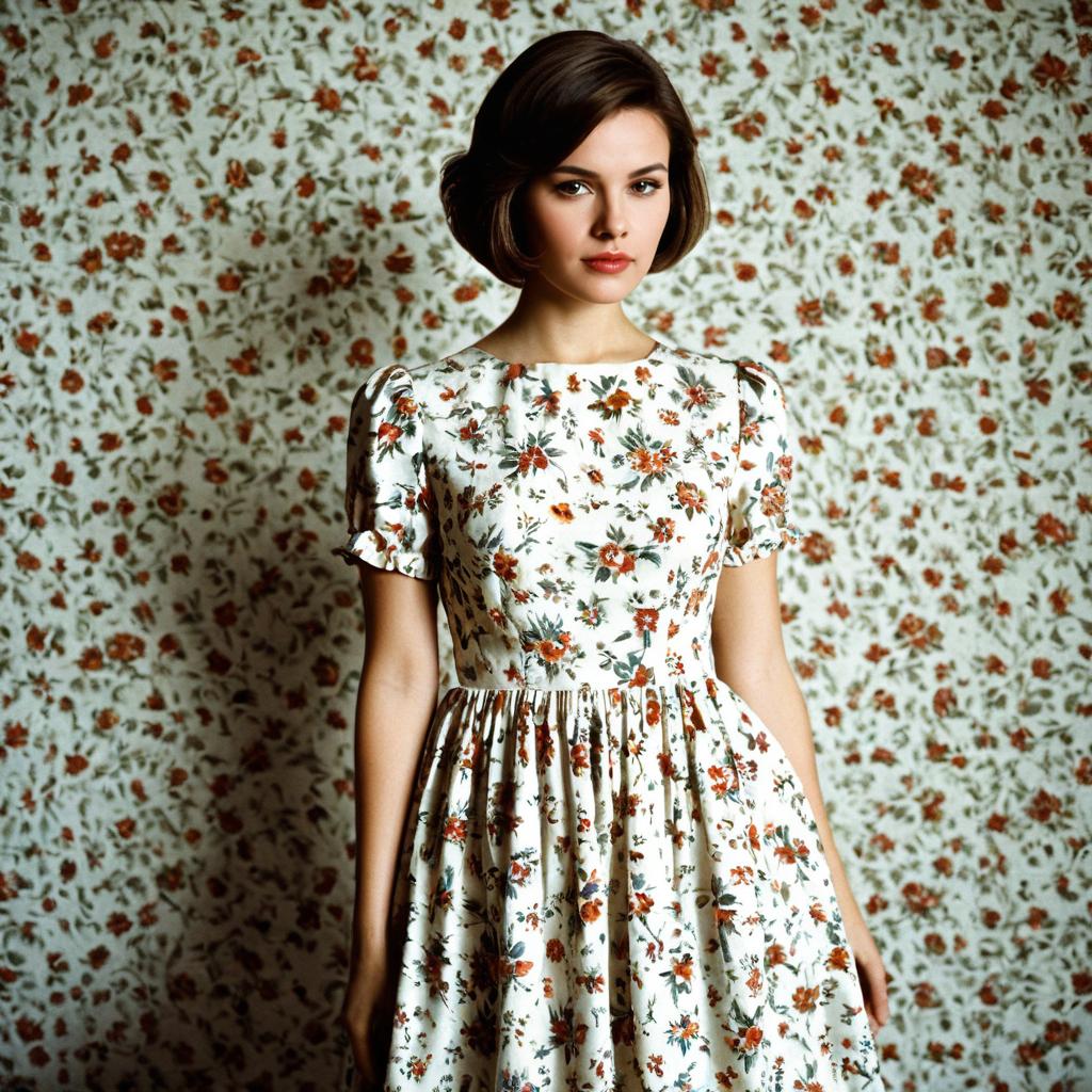 Portrait of a young woman with short brown hair wearing a white vintage dress featuring a floral print. The dress has short sleeves and a gathered waist. She stands against a matching floral wallpaper background, looking directly at the viewer with a neutral expression.