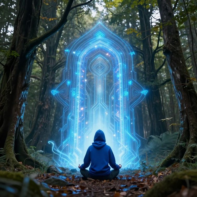 In this highly detailed and photorealistic image, a person in a blue hoodie is depicted in a meditative pose, sitting on the ground amidst a forested area. The scene is bathed in a soft, ethereal light, creating a serene and mystical atmosphere. A large, intricate, futuristic portal, glowing with a radiant blue energy, stands as the focal point, seemingly leading to another dimension or realm. The portal's geometric patterns and the light emanating from it suggest a powerful, otherworldly presence. Surrounding the portal are tall, dark trees with twisted branches, adding to the mystical and otherworldly ambiance. The ground is covered with fallen leaves and rocks, enhancing the natural, forested setting. The overall composition is balanced, with the portal and the meditating figure centrally positioned, creating a sense of harmony and tranquility. The image is rich in detail, with intricate textures and vibrant colors, capturing the essence of a powerful, spiritual experience in a visually stunning and immersive manner.