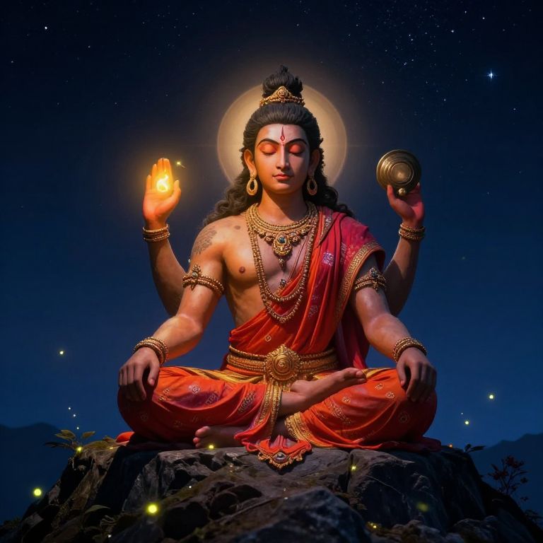 Hanumans portrayed as spiritual guardians meditating atop a mountain peak under a starry night sky, surrounded by ethereal fireflies, glowing aura, serene expression, vibrant colors with dramatic shadows, intricate tribal patterns on fur and garments.