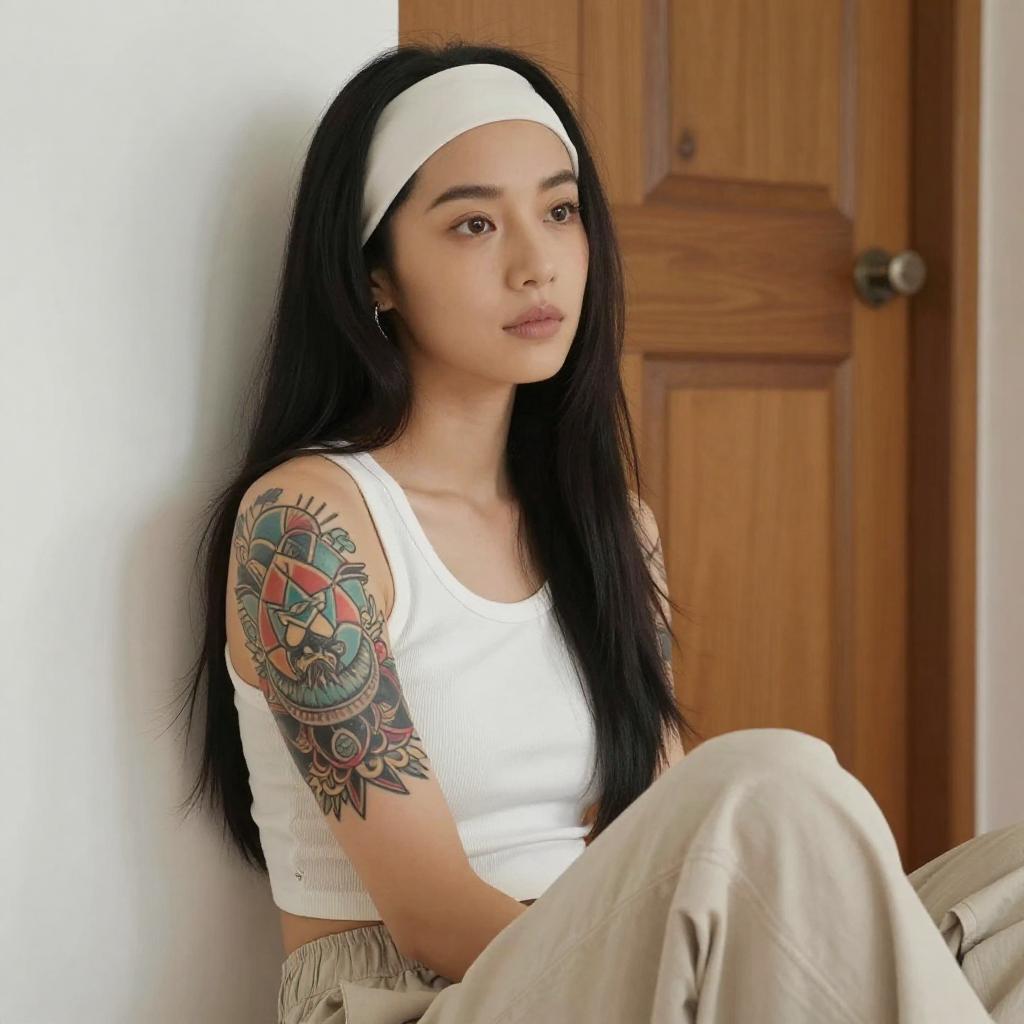 Photograph of a young woman with long black hair, wearing a white headband, white ribbed tank top, and beige pants. She has a colorful tattoo sleeve on her right arm featuring intricate designs. She sits against a white wall with a wooden door in the background, looking slightly to the side with a relaxed expression.