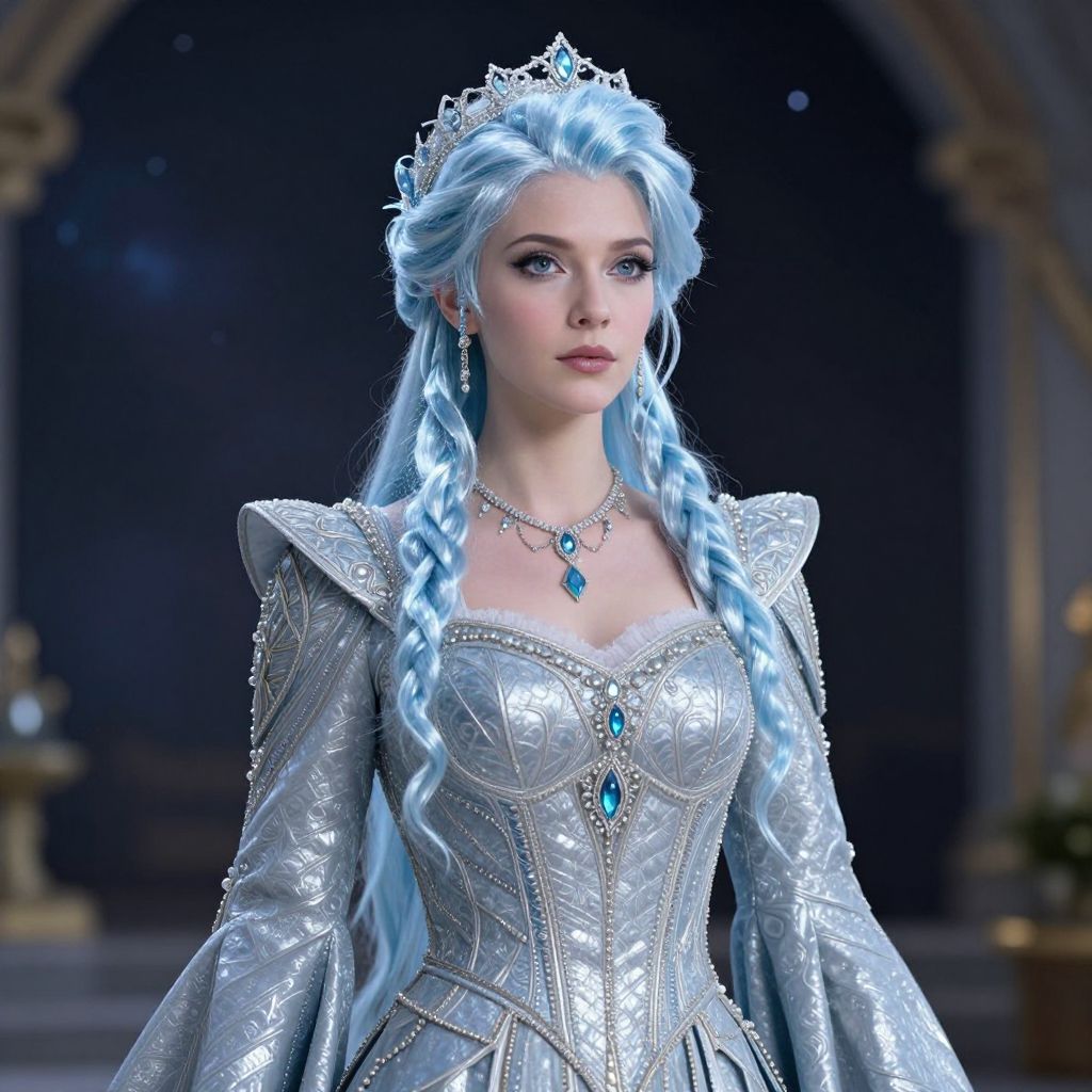 A digital CGI rendering of a fair-skinned, blue-eyed woman with long, braided, icy-blue hair, wearing an ornate silver gown adorned with intricate patterns and blue gemstones. She has a silver tiara on her head and matching jewelry, including a necklace and a brooch. The background is a dimly lit, grand hall with arched doorways and subtle, decorative elements. Her expression is serene and regal. The overall style is fantasy, with a focus on elegance and royalty. The lighting highlights her hair and gown, giving a magical, ethereal glow.