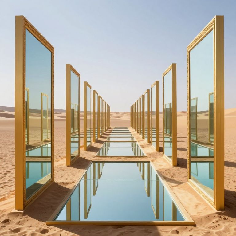 In a surreal desert landscape, rows of golden-framed mirrors extend into infinity, each reflecting a tranquil pool of water that defies the arid surroundings, creating an otherworldly corridor of endless reflections.