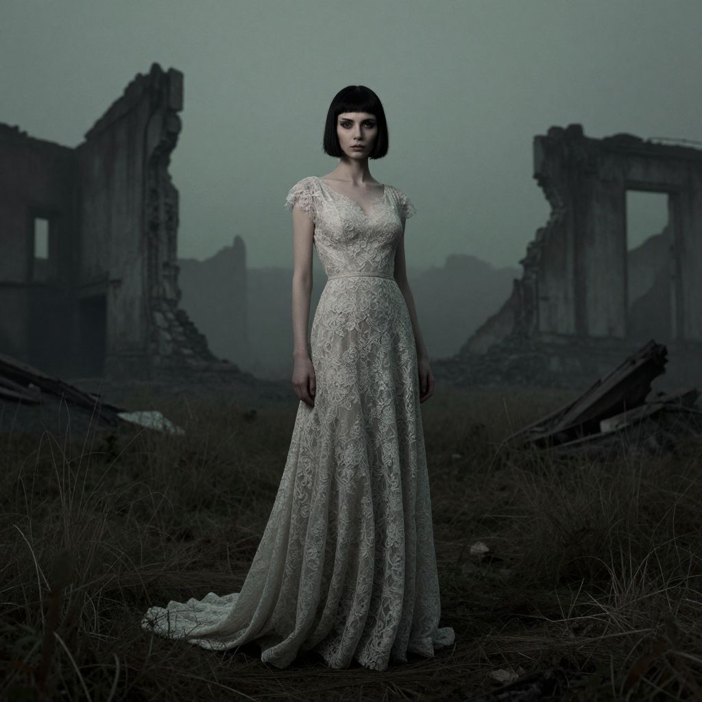 1 girl, avant-garde fashion model, short black hair, bare face with porcelain skin), lace dress, asymmetric design, high collar, geometric patterns, cinematic background of a decaying urban skyline, ruins softened by fog and diffused neon lighting, dynamic over-the-shoulder angle emphasizing silhouette and textures, contemplative and serene expression, minimalist earrings, subtle lace gloves, soft spotlight focused on model, gothic tones, 8k UHD, cinematic lighting, moody shadows, elegant contrast, intricate fabric textures, glowing accents on edges of clothing, lens flare from background neon, muted monochrome palette with green-grey tones, ambient atmospheric fog