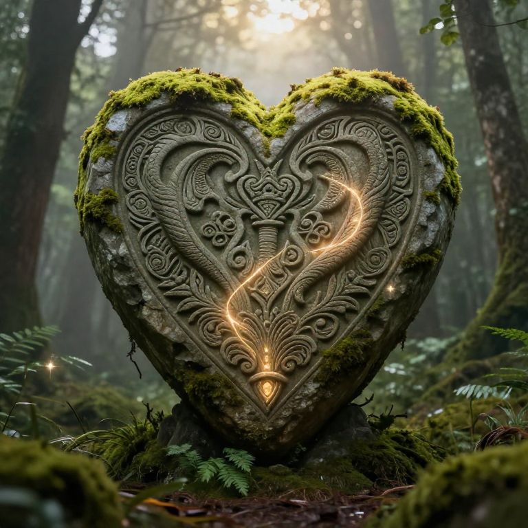 Heartshaped ancient stone sculpture covered with moss in a mystical forest, surrounded by fog and soft golden rays of sunlight, intricate engravings with a magical aura, fantasy art style with a surreal and enchanting mood