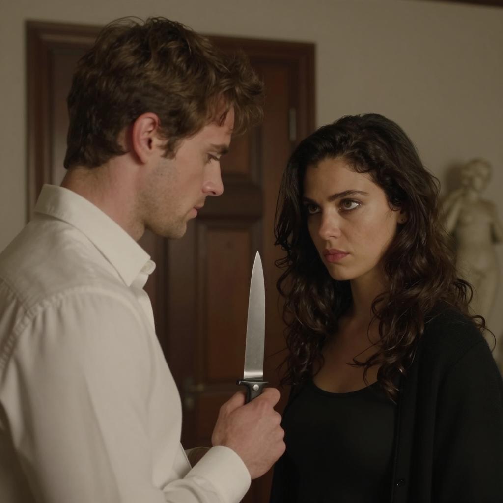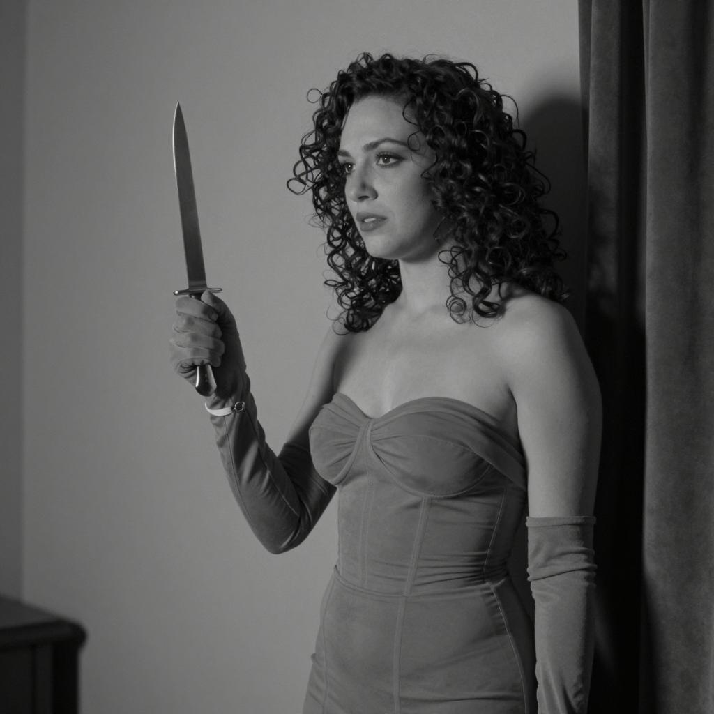 Woman with curly brown hair, smiling, holding a large knife in her right hand, raised above her head. Wearing a white, long-sleeved, lace-trimmed dress. Dark background. Low-angle shot. Single person.
