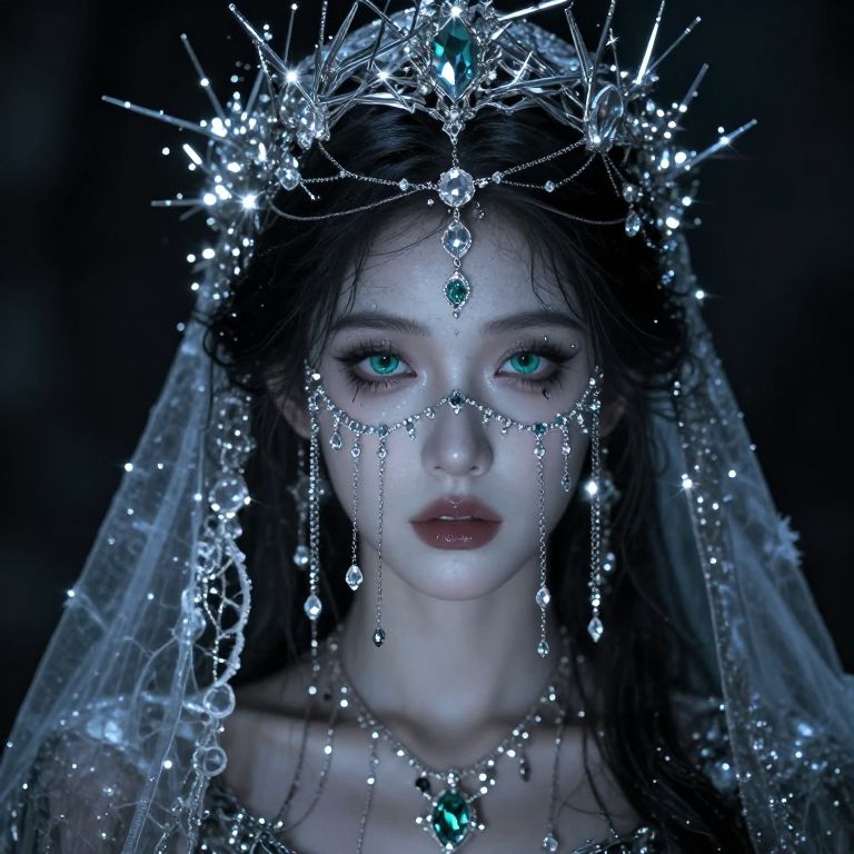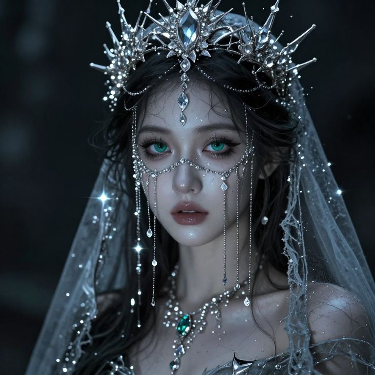 Digital artwork of a pale, ethereal woman with glowing blue eyes, wearing a sparkling, star-like silver crown and veil, adorned with diamond chains and