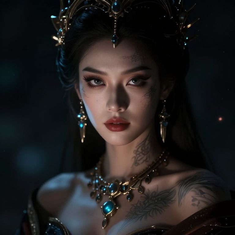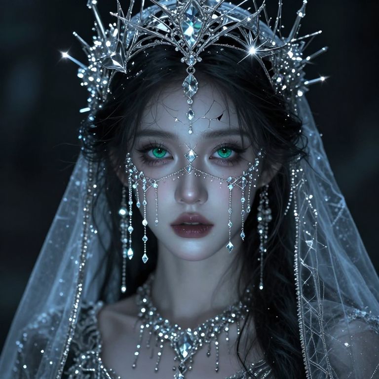 A enchantress materializes, her sad eyes are shattered emeralds, A tattered veil clings to her skin, casting an eerie silver glow, Chrome splinters crown her head, diamonds flashing like fireflies on a summer's night, A bejeweled latticework sprawls across her face, silver chains and diamonds glinting with manic light, Amidst this maelstrom, she remains serene, her gaze a cold, dark mirror reflecting the viewer's soul, A siren's call, beckoning deeper into the madness, her presence a whispered secret in the velvet darkness