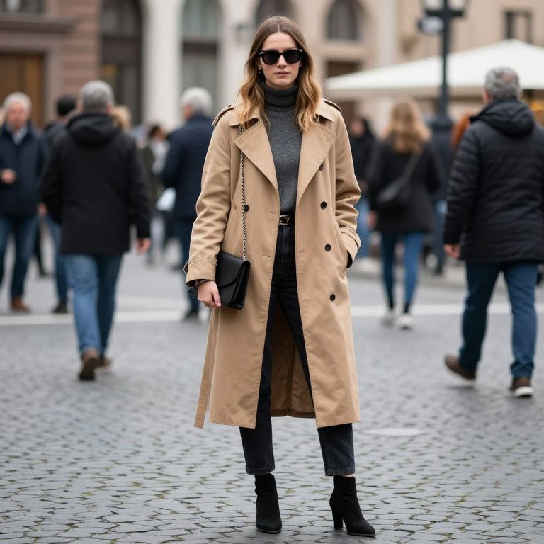 Photograph of a young white woman with long brown hair and fair skin, wearing black sunglasses, a grey turtleneck, and a beige knee-length trench coat with black buttons. She carries a small black crossbody purse and wears black ankle boots. She stands in a cobblestone street, surrounded by blurred pedestrians in winter clothing, including black jackets and hoodies. The background features urban architecture with stone buildings and a streetlamp. The overall style is modern and chic, with a focus on autumn or winter fashion.