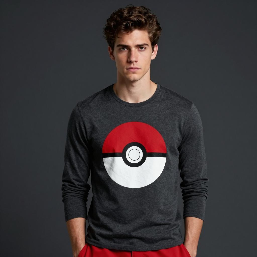 Pokeball, photorealistic, young man, dark brown wavy hair, fair skin, serious expression, wearing dark gray long-sleeve shirt with red and white pokeball on chest, red pants, standing, dark ured background, digital art, realistic lighting, anime-inspired, casual style, portrait, upper body, medium shot