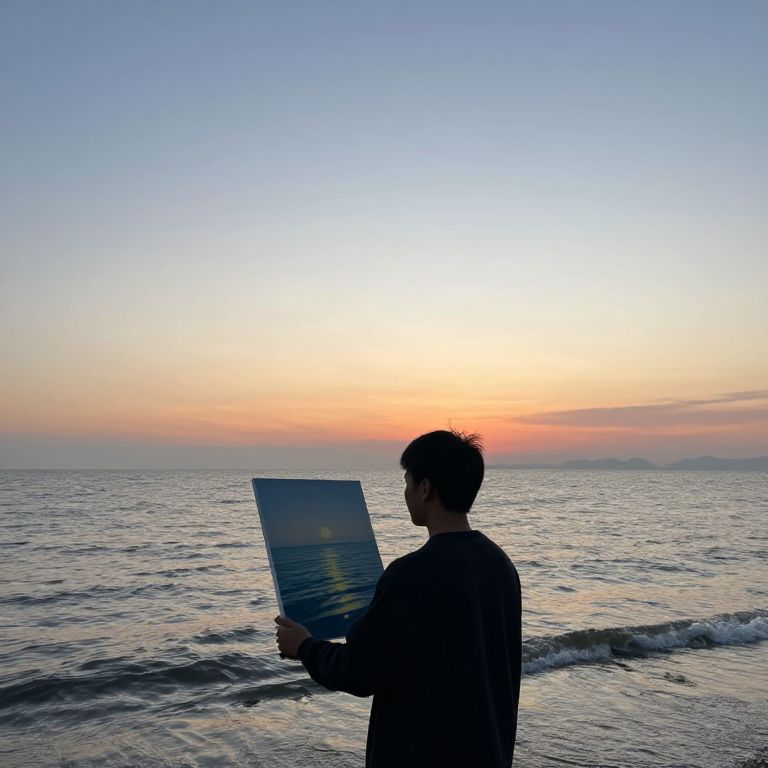 Standing before the boundless horizon, the artist holds a canvas that mirrors the infinite expanse of the sea, where the interplay of light and shadow whispers of dreams, while the gentle hum of waves and the warmth of the setting sun evoke a profound sense of serenity and introspection.