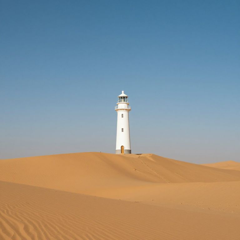 A lighthouse stood silent in the middle of a desert dune, its beacon guiding lost cities from the sky.
