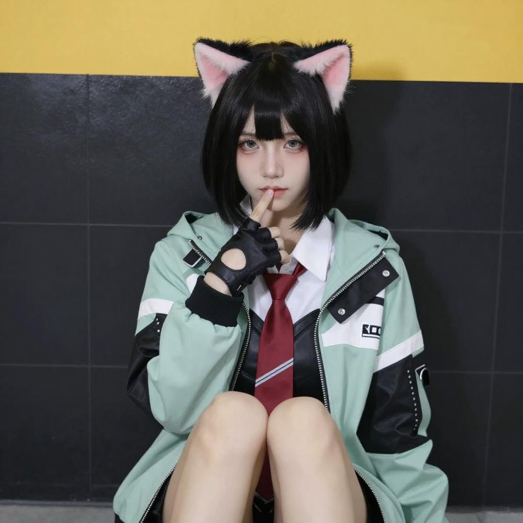 Photograph of an Asian woman with pale skin and black hair in a cosplay outfit. She wears a white and black jacket with black gloves, holding a black and red object. She has pink cat ears and is seated against a black tiled wall with a yellow sign above. Her expression is neutral, and she is illuminated by bright light.