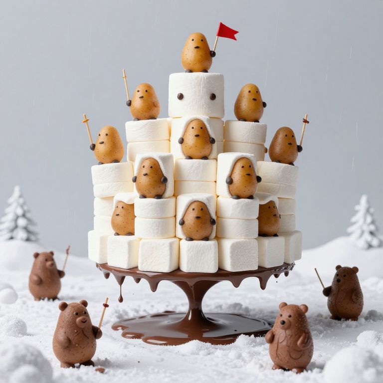 A whimsical marshmallow fortress, adorned with baked-potato sentinels wielding sticks, hovers serenely above a snowy landscape, encircled by dripping pools of hot chocolate rain and defended against cocoa-bear invaders in a surreal, dreamlike tableau.