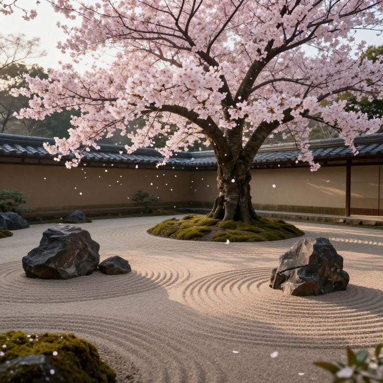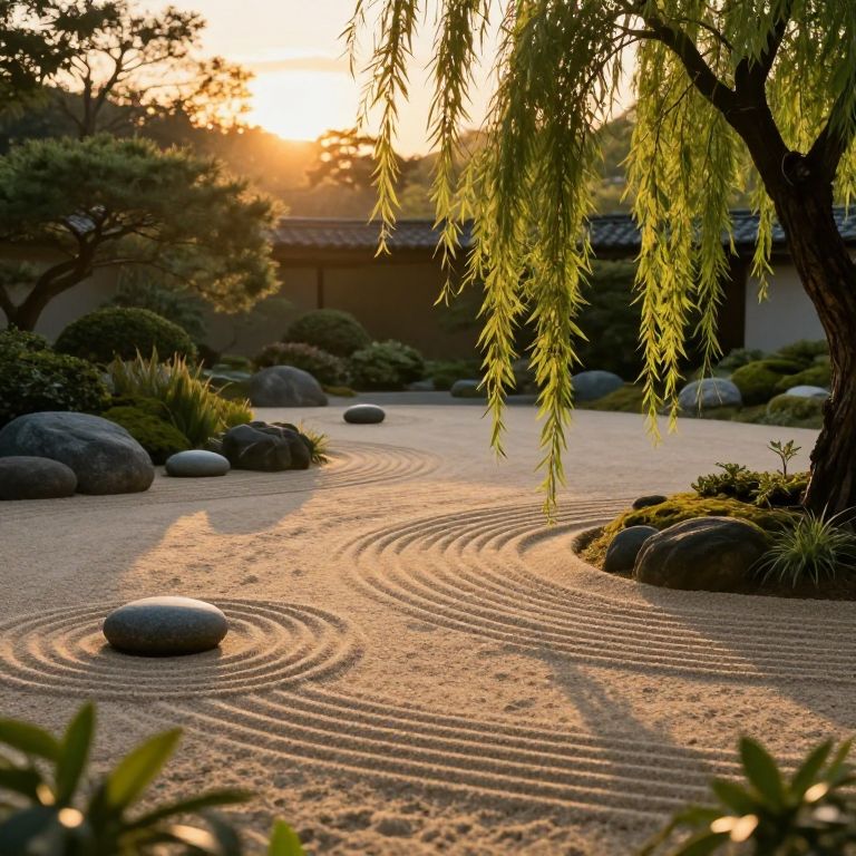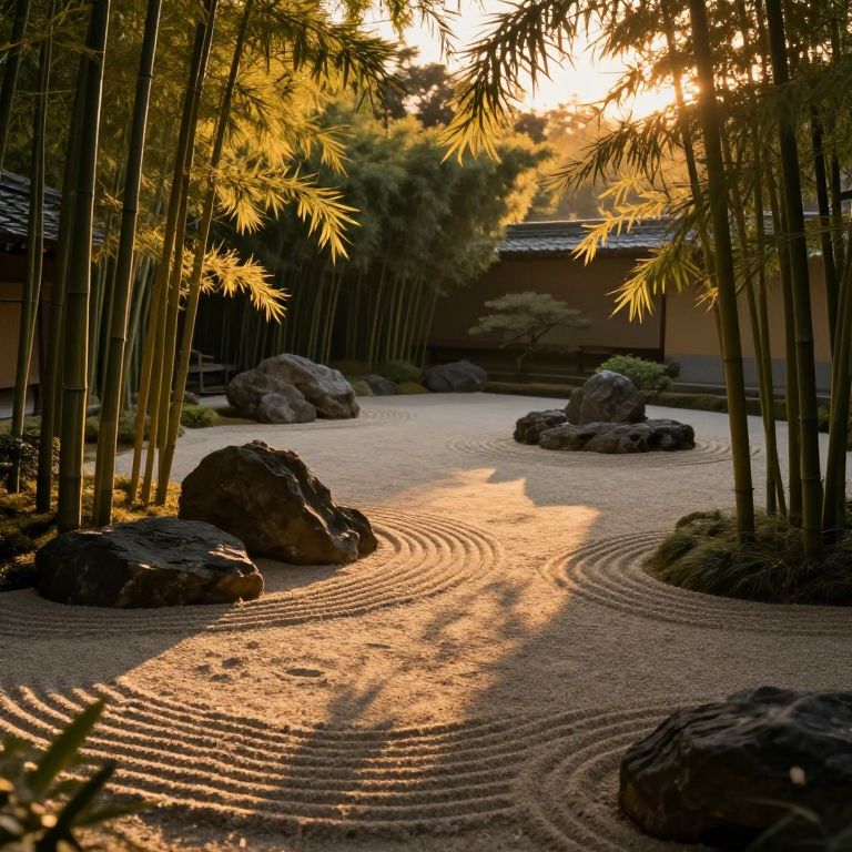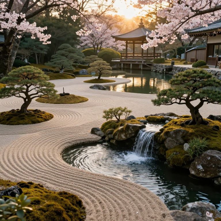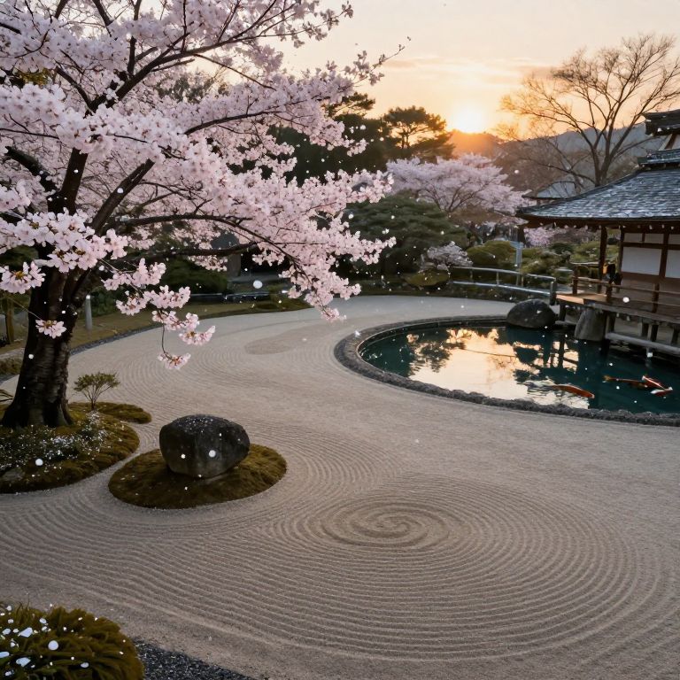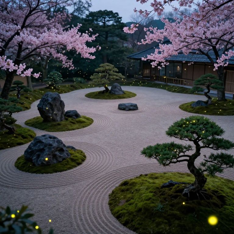 In the surrealistic style reminiscent of Dalí's dreamlike visions, create an image of a tranquil Zen garden bathed in the soft glow of twilight. From a bird's eye view, capture the intricate details of this harmonious landscape, from the delicate bonsai trees to the shimmering pebbles arranged in raked sand patterns. At the heart of the scene lies a giant clock face, its surface melting and radiating a warm light that casts elongated shadows across the serene setting. This enchanting fusion of reality and fantasy evokes a sense of timelessness and dreamlike wonder within the meticulously crafted garden.