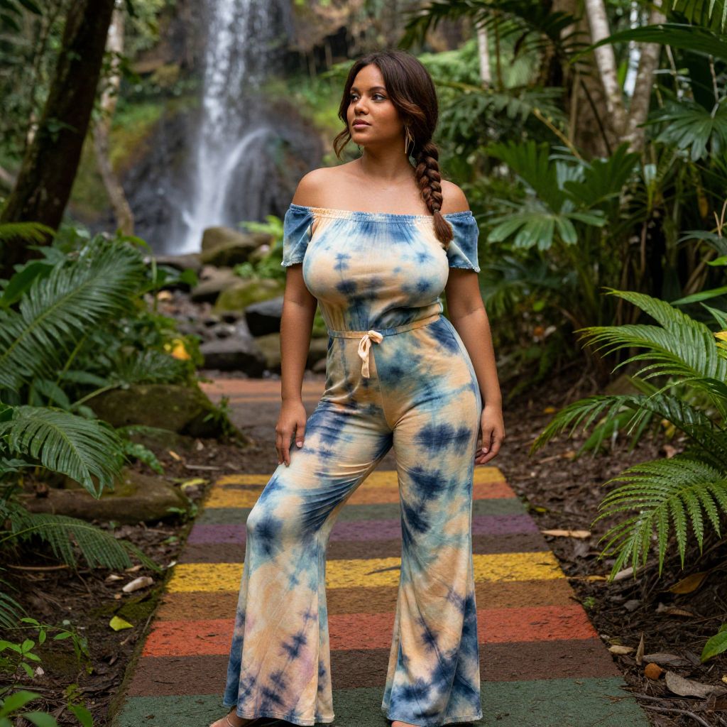 An adventurous tie dye woman in a retro 1970s-inspired costume posing on a colorful jungle trail in a tropical rainforest, her face has soft caramel skin and a serene expression with natural brown hair tied in a braid, wearing a tie-dye jumpsuit with an off-the-shoulder top and wide-legged pants, surrounded by green plants and a small waterfall in the background. The woman has big tits and cute face