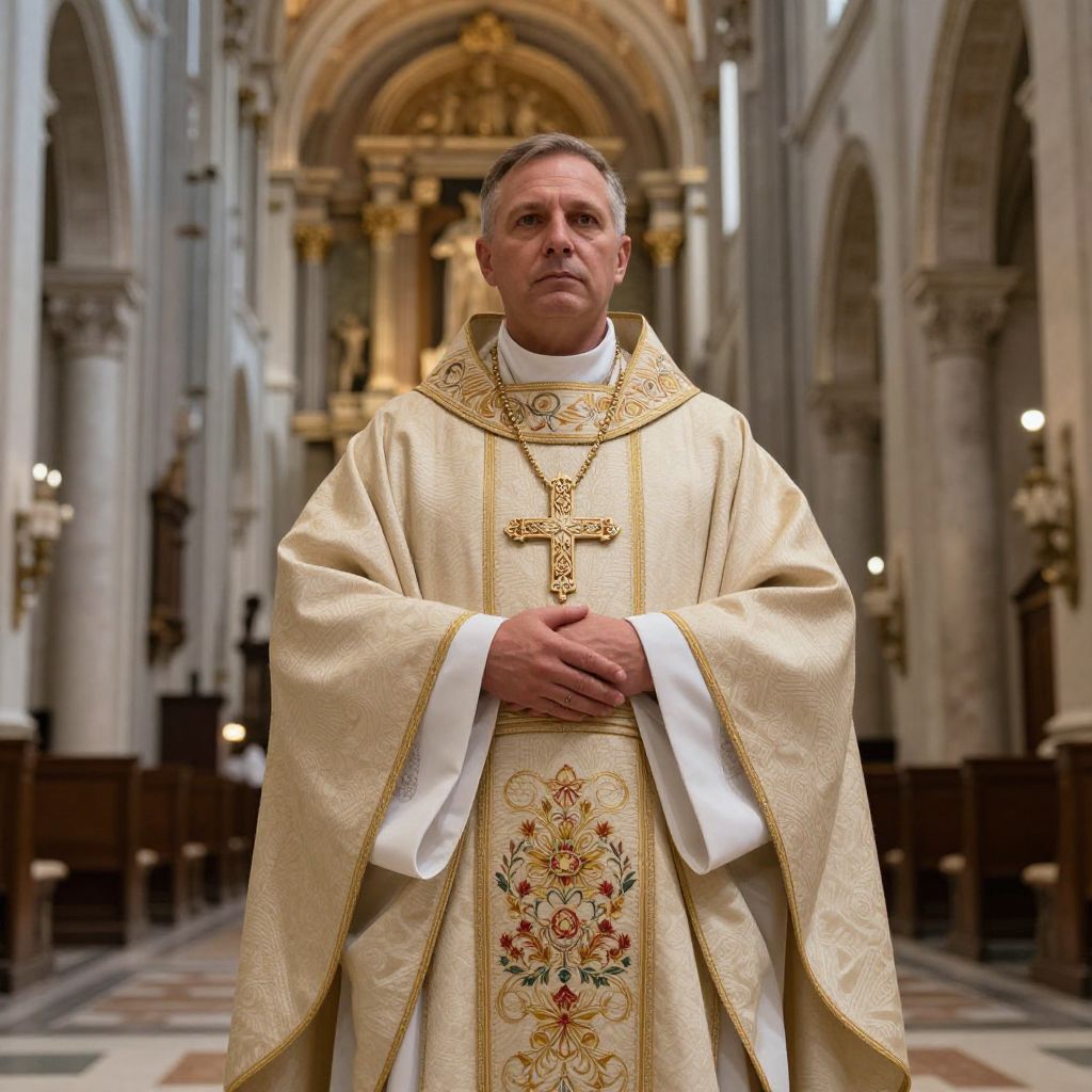 A man dressed in ornate ecclesiastical robes, featuring intricate embroidery and a large cross necklace, stands solemnly in a grand, historic cathedral interior. The image captures a classical and reverent atmosphere with soft lighting highlighting the detailed textures of the ceremonial attire.