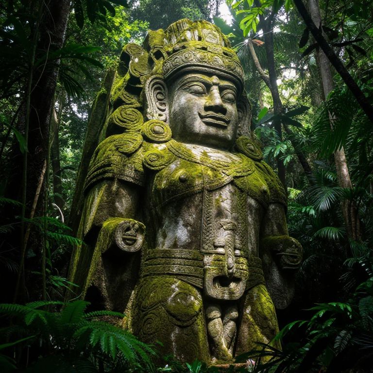 Photograph of a moss-covered, ancient stone statue of a serene, armored deity with intricate details, standing amidst dense, lush green jungle foliage.