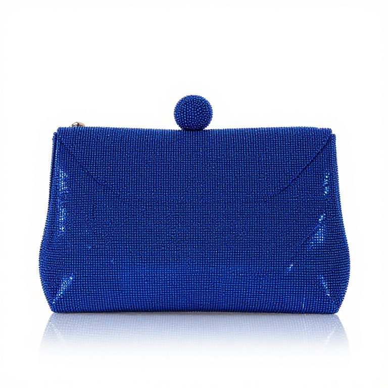 Photograph of a rectangular, deep blue clutch purse with a textured, beaded surface that sparkles under light. The clutch has a small, matching blue bead at the top center, serving as a clasp. The background is completely white, making the vibrant blue color of the clutch stand out. The clutch is centered in the image, with a subtle reflection on the surface below it, adding a slight glossy effect. The overall style is modern and elegant, suitable for formal occasions.