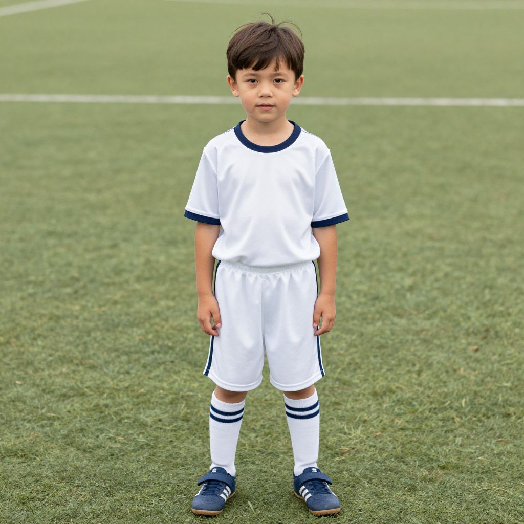 Childrens football clothes, 1boy, solo, male focus, realistic, soccer uniform, sportswear, brown hair, looking at viewer, sneakers, shoes, full body, shorts, shirt, white shorts, standing, from above, photorealistic
