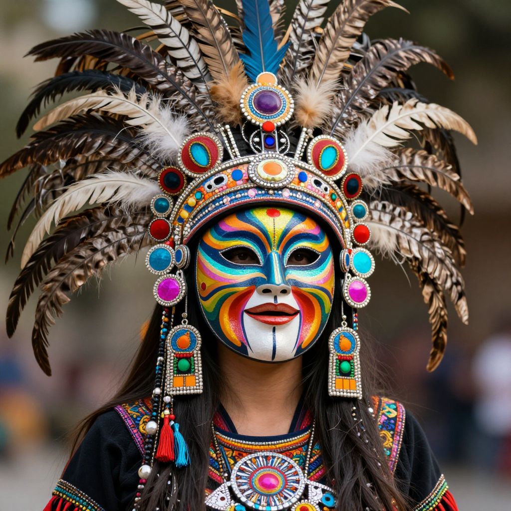 Aztec-Inspired Woman with Psychedelic Mask