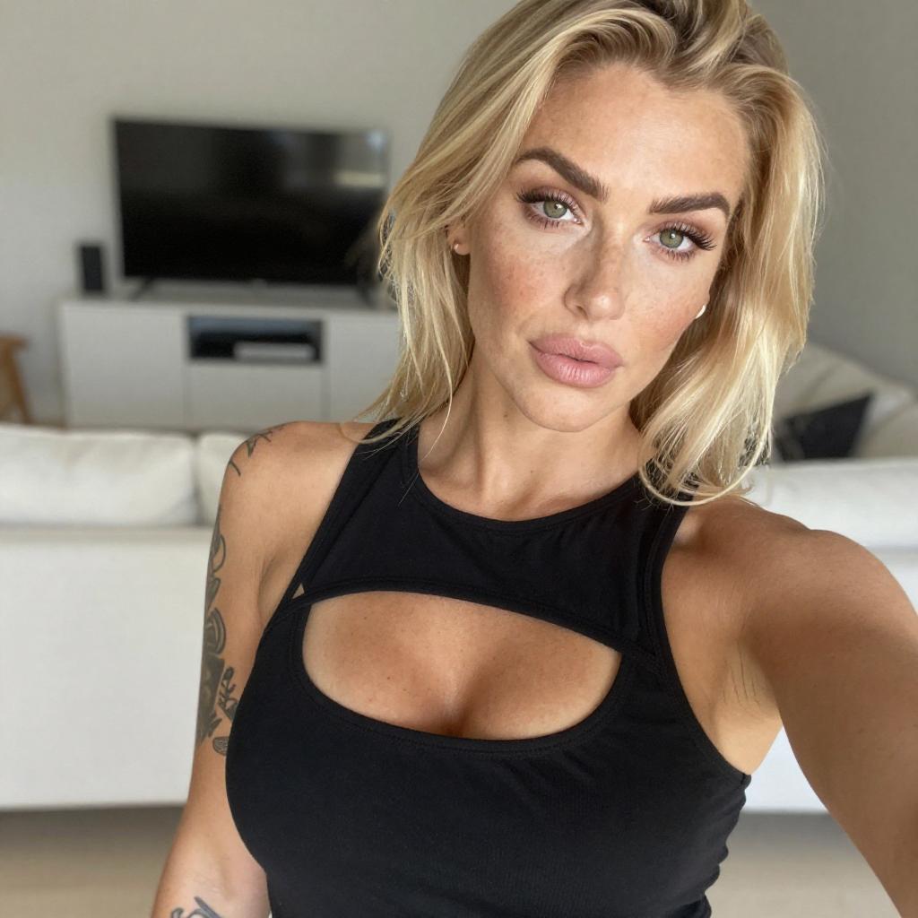 Photograph of a blonde woman with light skin and freckles, taking a selfie at a slightly low angle. She has green eyes, full lips, and tattoos on her right arm. She's wearing a black, cut-out top that reveals cleavage. The background is slightly blurred, showing a white couch with a TV and some objects on it. Lighting is natural, coming from the left side. Depth of field is shallow, focusing on her face and upper body.