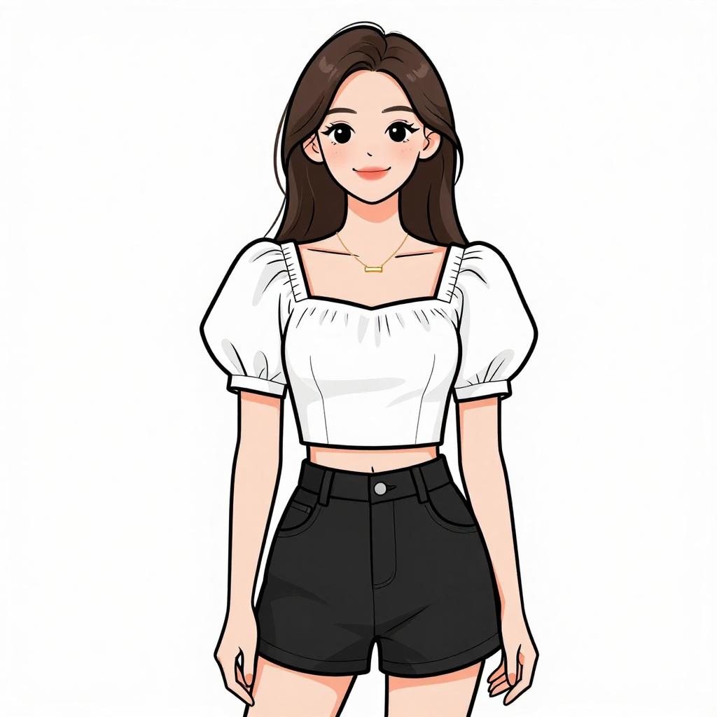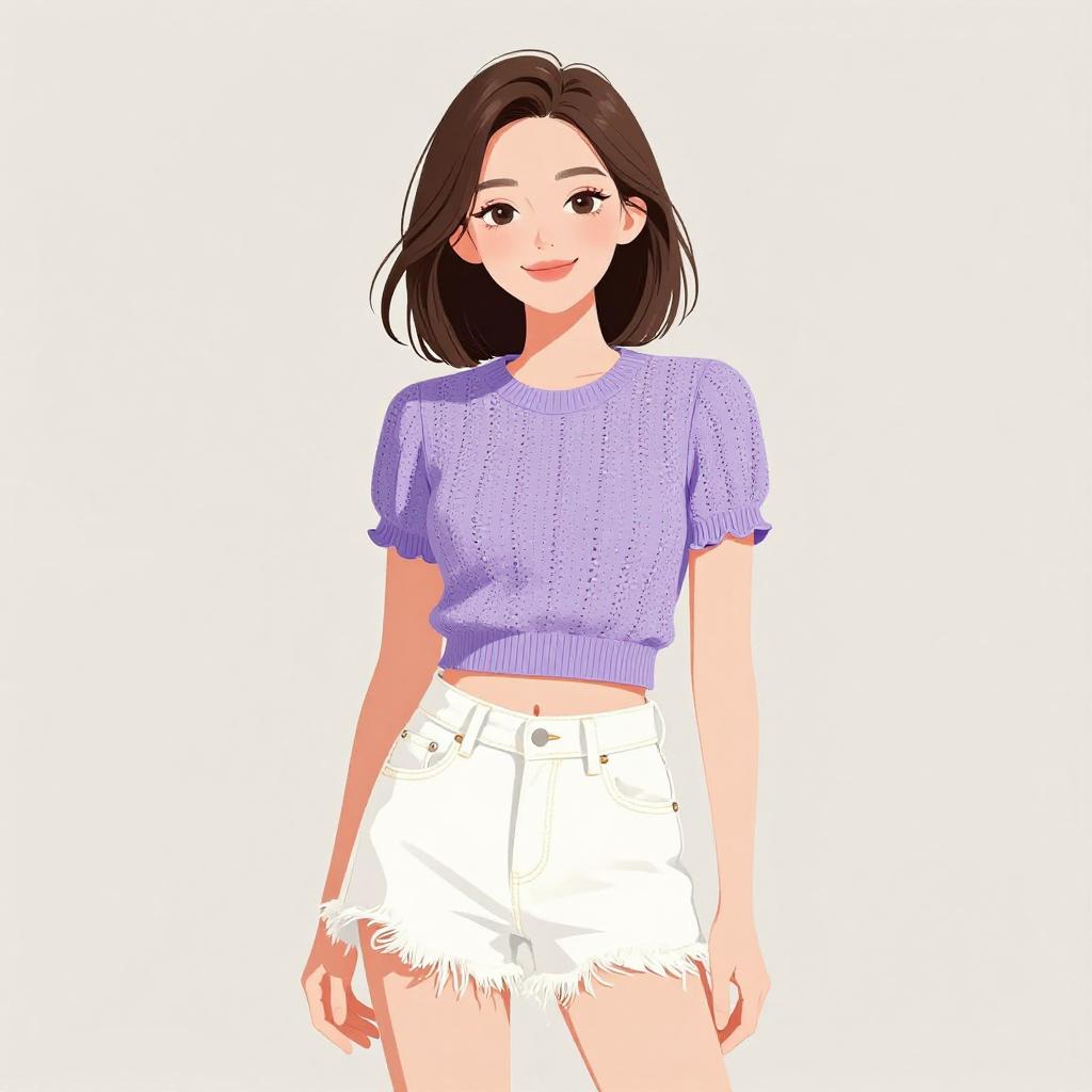 Woman with pretty face and pretty hair. smiling Woman, casual summer style, white cropped eyelet blouse with short puff sleeves, sweetheart neckline with ruffle trim, front tie detail, fitted cuffs, paired with high-waist shorts in lavender and white vertical stripes, relaxed fit, black belt accessory with silver buckle draped on shorts, studio background with a neutral color gradient. --sref 1467
