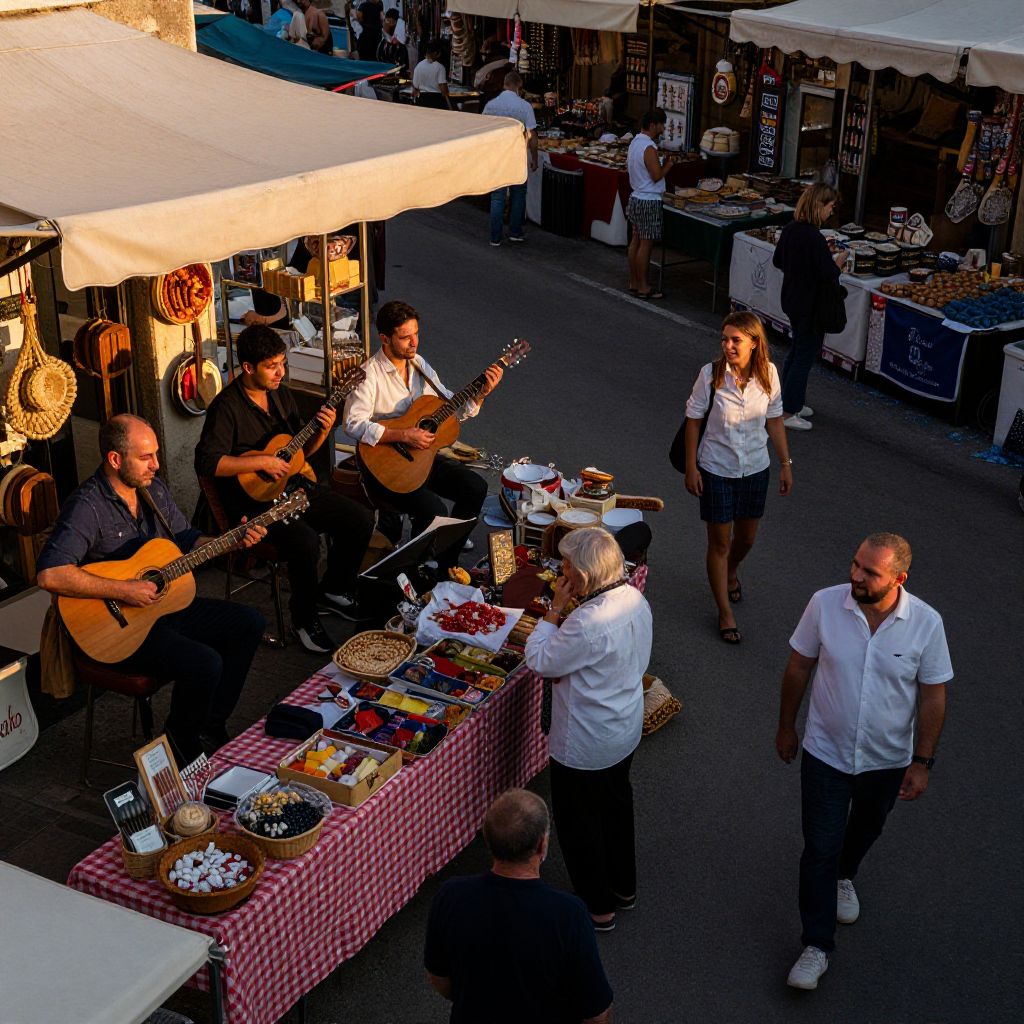 Photograph of an outdoor market stall with four men playing acoustic guitars, sitting under a white tent canopy. The stall has a red and white checkered table displaying various items, including jars, bowls, and baskets. A woman in a white shirt and black pants walks by, while two men in white shirts and black pants stand nearby, looking at the stall. The background features additional market stalls with white canopies and various goods. The scene is brightly lit with warm sunlight, casting shadows on the asphalt.