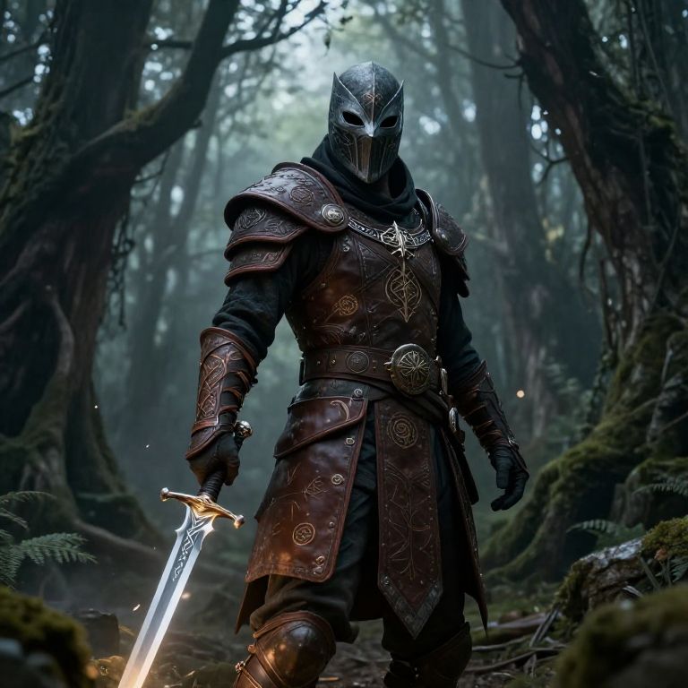 Masked DnD character standing in a dimly lit ancient forest, wearing intricate leather armor with mystical runes, holding a glowing dagger, mysterious aura, fantasy art style, detailed environment with fog and twisted trees, dynamic lighting