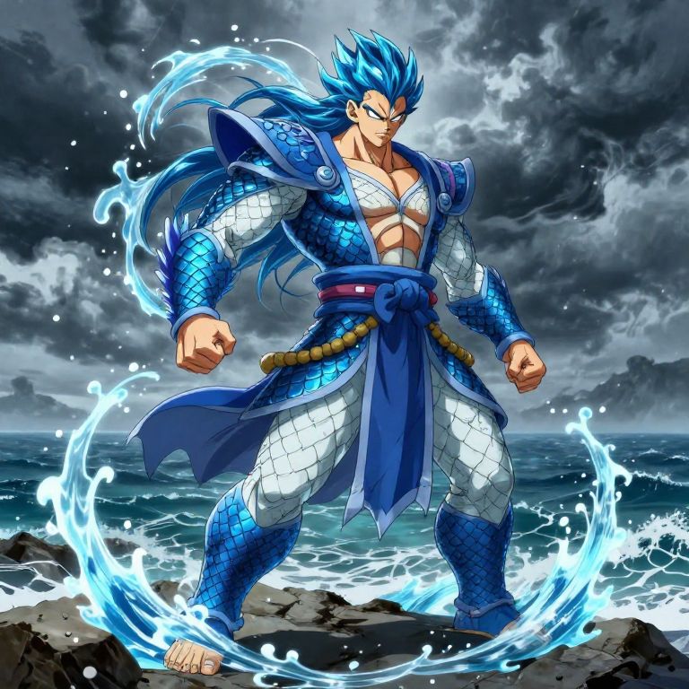 Digital anime-style drawing of a muscular, blue-haired warrior with fish-scale armor, standing on a rocky shore with water swirling around. Dark stormy sky