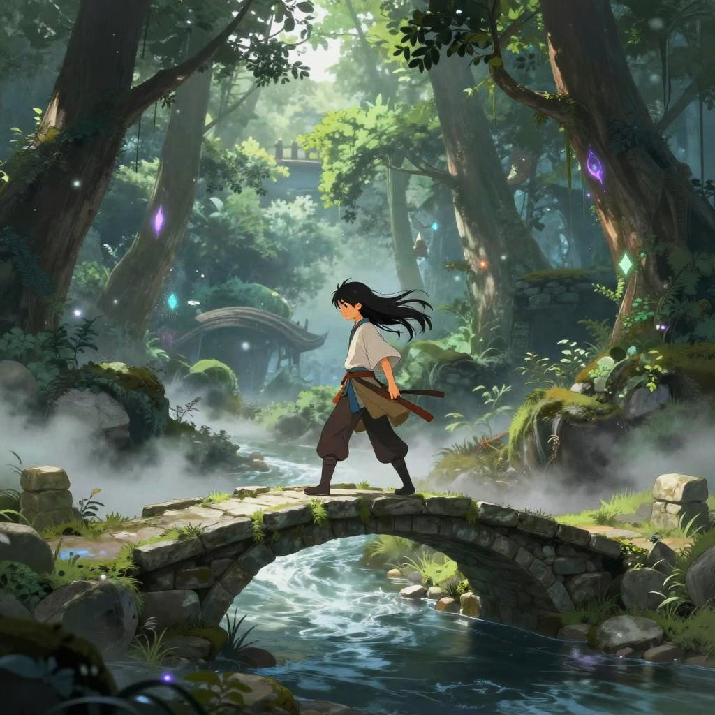 Mid journey anime fantasy setting with a young hero crossing an ancient stone bridge over a misty river, dense enchanted forest surrounding the scene, detailed character design with flowing hair, and magical glowing effects enhancing the mystical vibe.