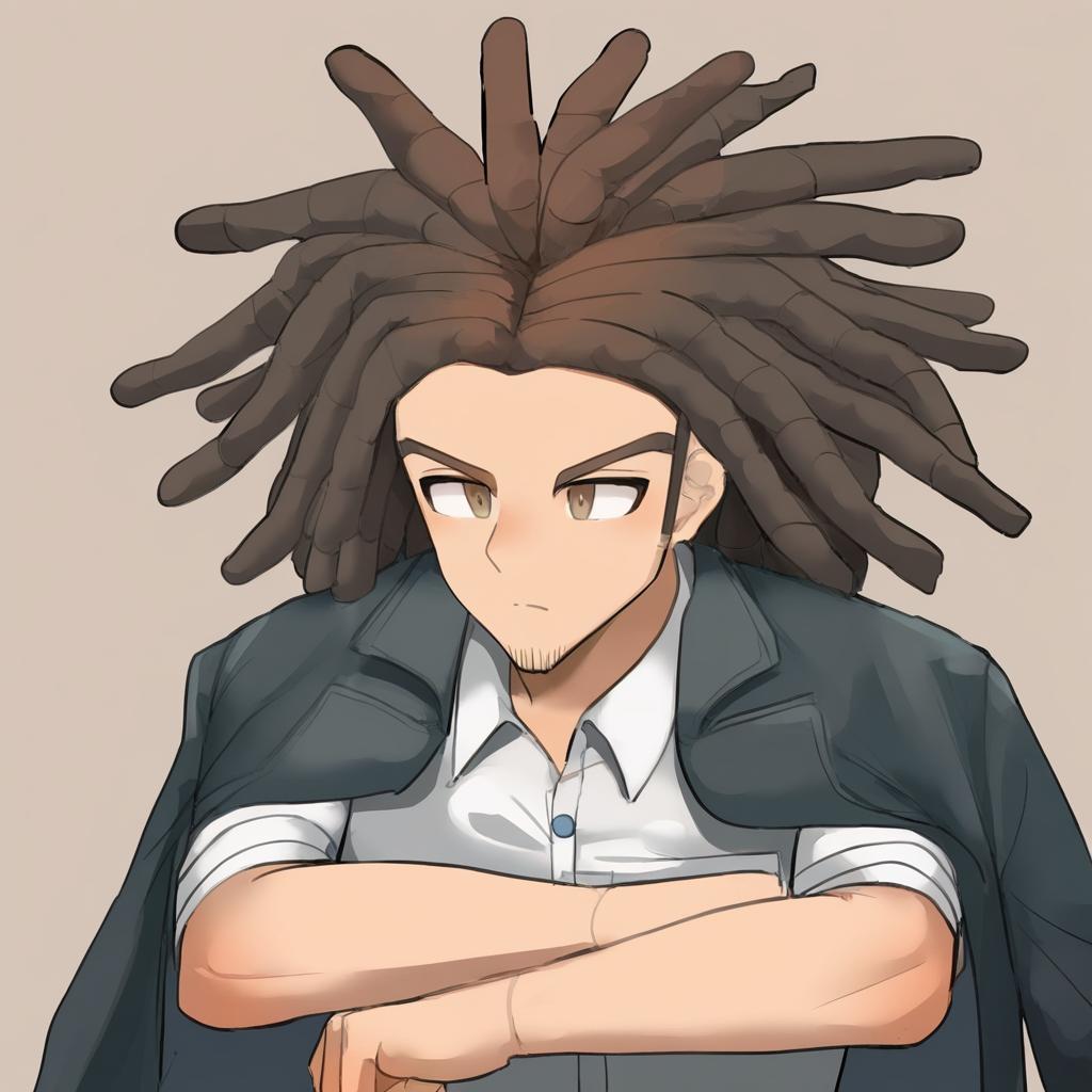 Digital anime-style illustration of a young man with brown dreadlocks and brown eyes. He has a light stubble and is wearing a white collared shirt with a dark jacket draped over his shoulders. The character has a calm and serious expression, with arms crossed in front.