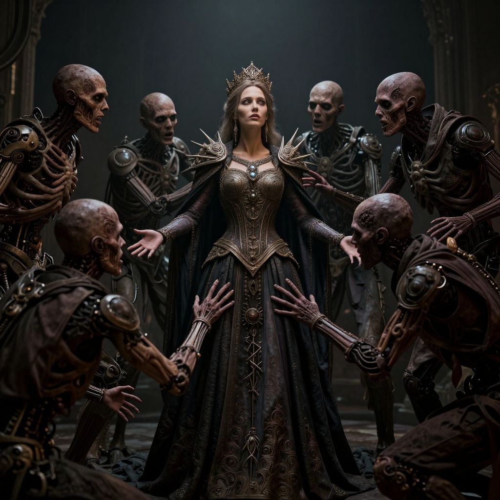 Photograph-like digital art: Queen with ornate black gown and crown, surrounded by skeletal warriors with mechanical armor, in dimly lit, gothic