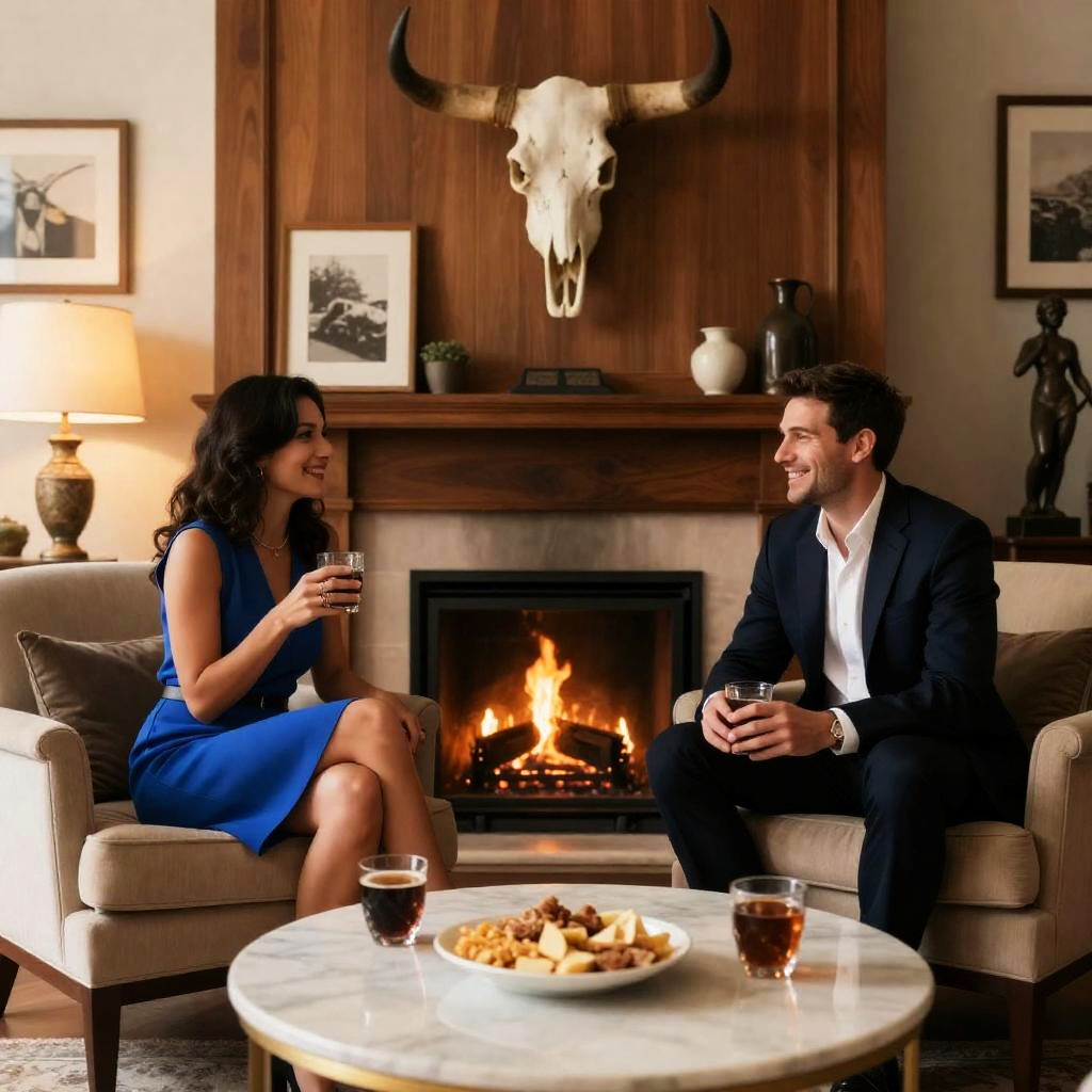 Photograph of two people sitting on beige armchairs in front of a lit fireplace. Woman in blue dress, dark hair, holding glass, smiling. Man in dark suit, holding glass, smiling. Marble coffee table with snacks and drinks. Wooden-paneled wall with cow skull, framed pictures. Lamp on left, statue on right. Soft lighting, cozy atmosphere.