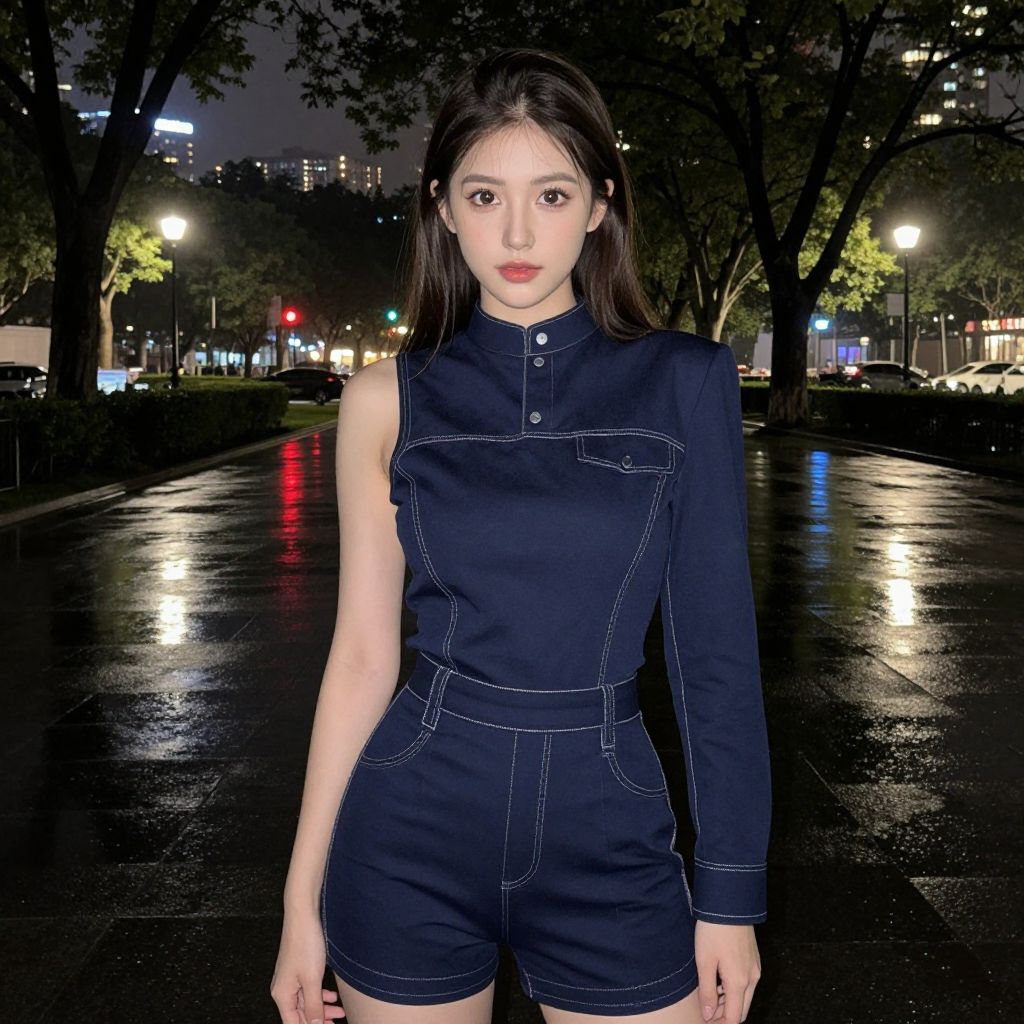 A natural lighting portrait of a vibrant female in her early 20s with fair skin and large expressive brown eyes, wearing a modern navy blue costume outfit including a navy blue jumpsuit with bold silver stitching, standing in a rainy night park with city lights reflecting off wet pavement and trees.