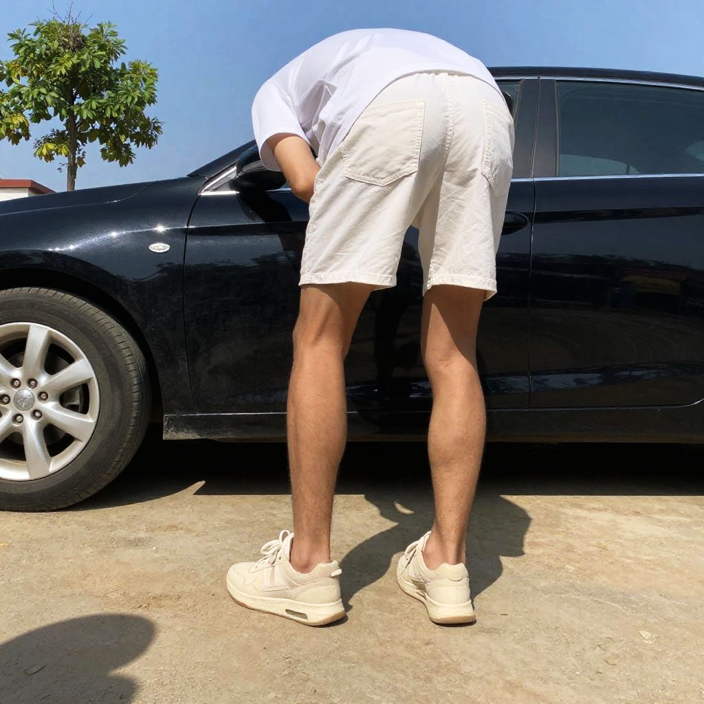 Photograph of a person bending over in front of a black car, taken from a low angle. The person is wearing a white shirt, white shorts, and beige sneakers. Their legs are prominent, casting long shadows on the dusty, sunlit ground. A tree and clear blue sky are in the background. The image has a slightly exaggerated, almost cartoonish style.
