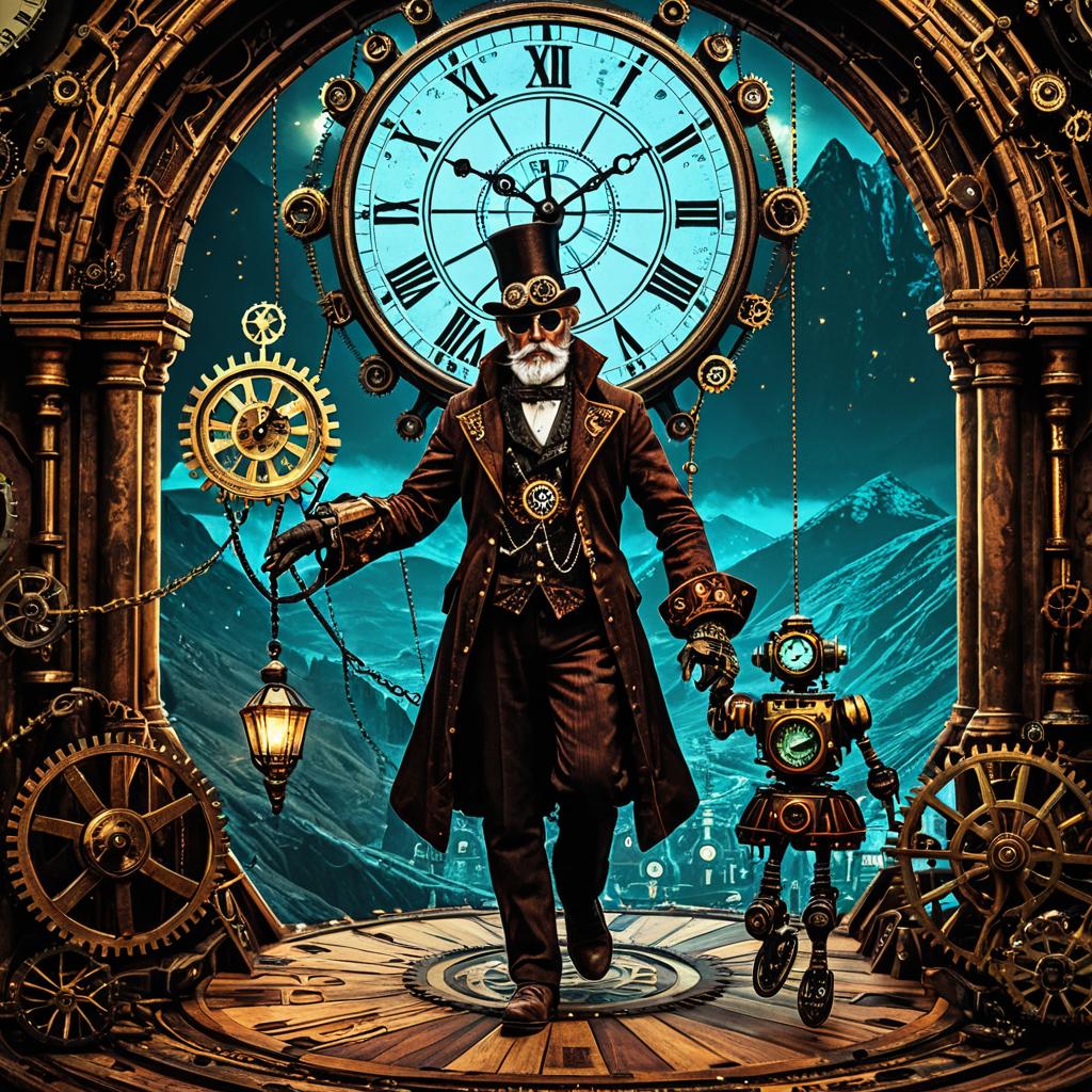 (Steampunk psychedelic artstyle), a enigmatic puppeteer wearing mechanical gloves walking with a stringed marionette with clockwork joints, surrounded by floating gears and luminous threads. Set against a surreal mountainous terrain with intricate intricate clock faces, cogs, and weaving bracelets. The scene is illuminated by ambient glowing light, adding atmospheric depth and a whimsical, mysterious vibe. Rendered in rich earthy tones with vibrant, contrasting colors and vintage textures, ultra-detailed in HD quality. Captures the essence of The Hermit, blending mysticism with intricate steampunk details.