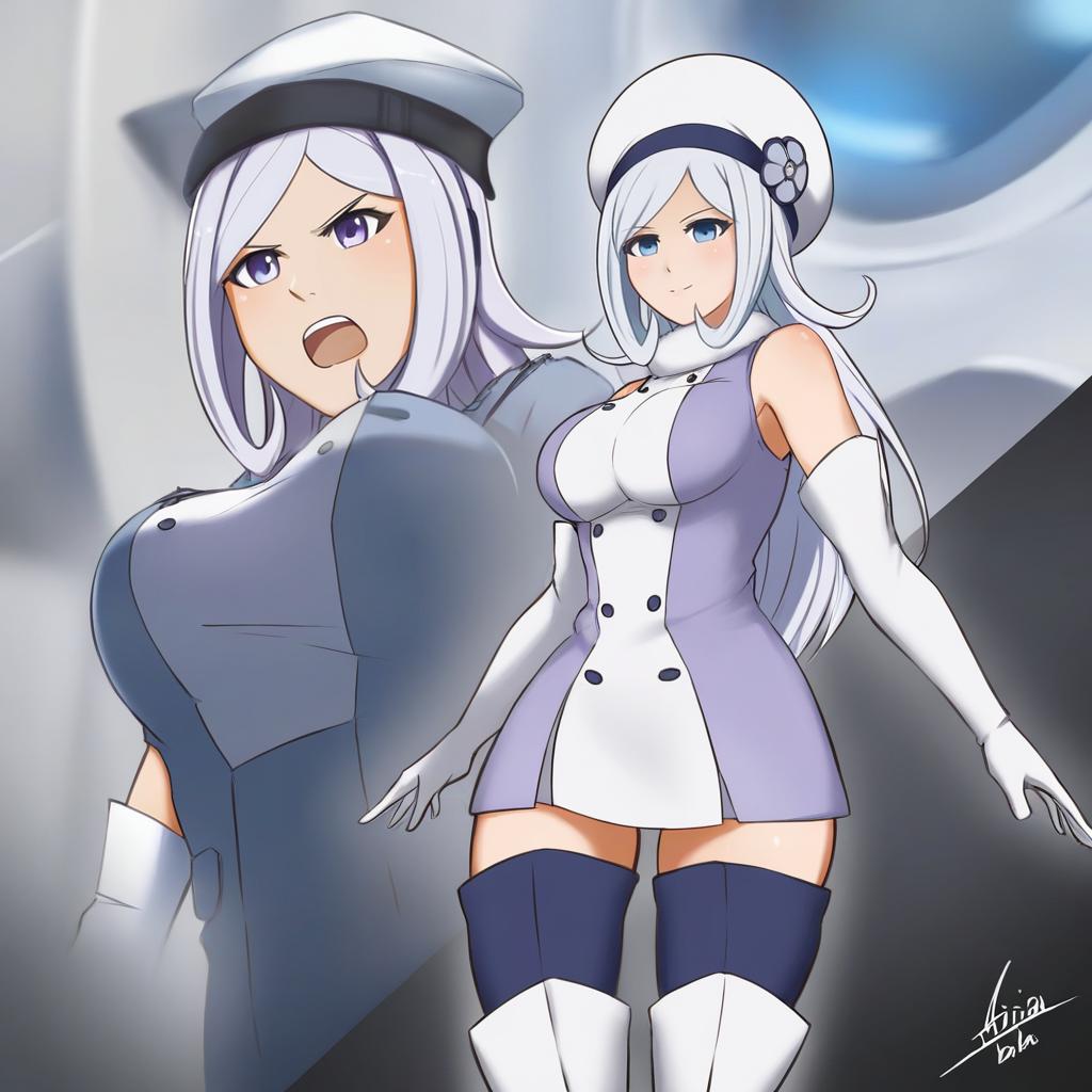 Aila jyrkiainen, gundam, 1girl, blue eyes, long hair, grey hair, white hair, medium breasts, large breasts, thigh boots, elbow gloves, hat, bare shoulders, by artist paint musume, leet