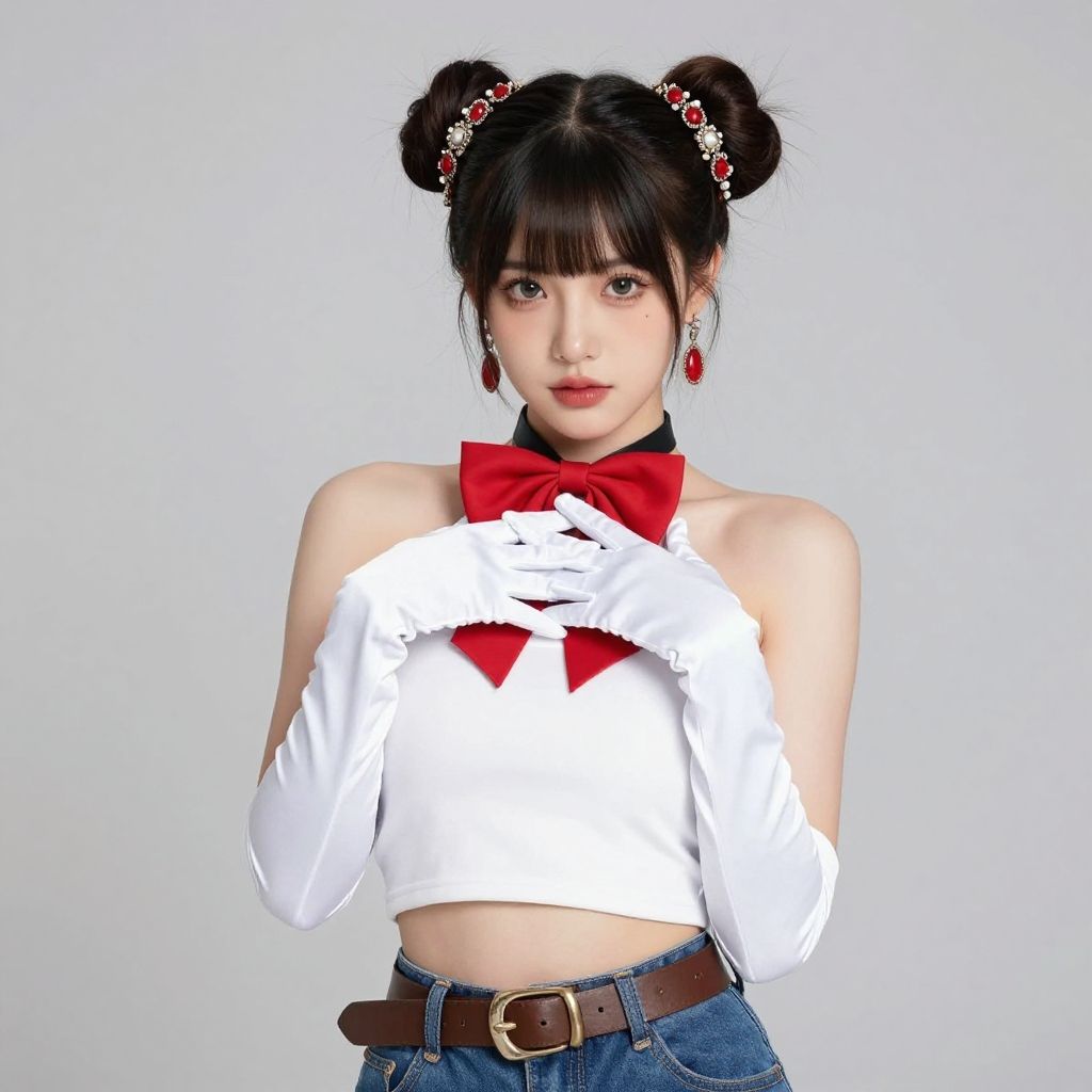 Masterpiece, best quality, highres, 1girl, aausagi, double bun, twintails, parted bangs, hair ornament, circlet, jewelry, earrings, choker, red bow, white gloves, elbow gloves, blue skirt, cowboy shot, standing
