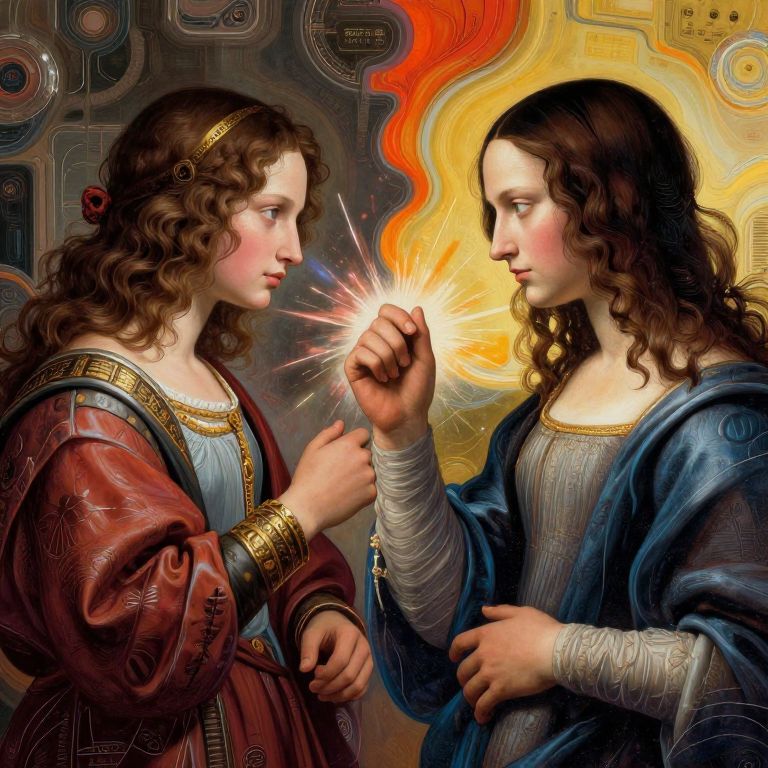 Weave together the enchanting allure of Pre-Raphaelite artistry with the digital precision akin to Da Vinci's \"The Annunciation\" to craft an alluring, high-definition image. Portray an ethereal being divulging heavenly tidings to a human figure amidst a whimsical garden landscape, where intricate botanical arrangements and luminous celestial objects blend seamlessly with the mystical atmosphere. This scene is captured from an overhead viewpoint, offering both a panoramic and intimate perspective that accentuates the interplay between the celestial and terrestrial realms, thereby evoking a profound range of emotions encompassing reverence to introspection.