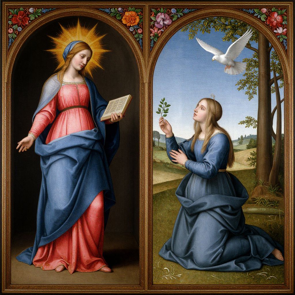 Digital art of two angelic women in flowing robes, one white, one purple, praying under a radiant sun, surrounded by mystical garden.
