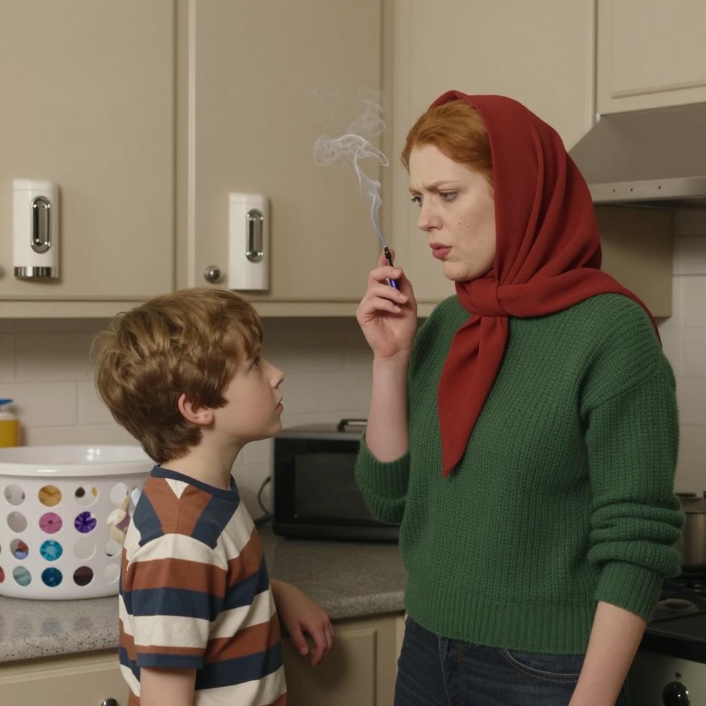 Two people in a small kitchen. Woman with red hair in a green sweater and red headscarf, smoking, looking at a boy with brown hair in a striped shirt. Kitchen has beige cabinets, soap dispenser, and laundry basket. Boy stands at a counter, woman stands slightly behind. Woman's expression is intense, boy's expression neutral.