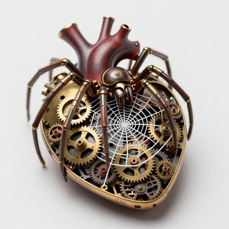 A captivating steampunk-inspired scene showcases a diminutive mechanical spider delicately crafting intricate webs among gears and sprockets within an openwork mechanical heart. Viewed from above, this whimsical tableau emphasizes the delicate equilibrium of life thriving amidst complex machinery, instilling a sense of awe and fascination as both grace and functionality harmoniously coexist in this enthralling world of brass, iron, and intricate motion.