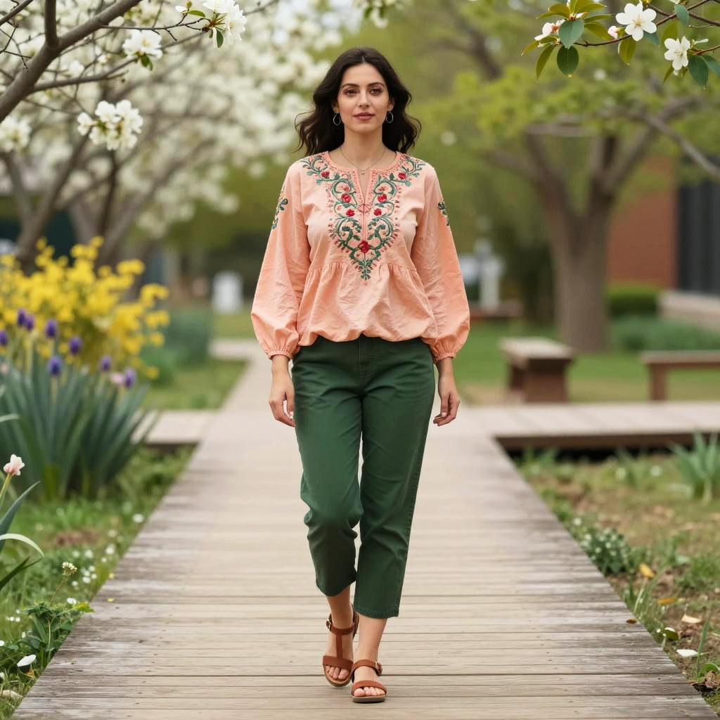 A woman stands confidently on a wooden pathway surrounded by lush greenery and blooming flowers. She is dressed in a peach embroidered blouse paired with dark green cropped pants and brown sandals, exuding a casual yet stylish vibe perfect for a spring day.