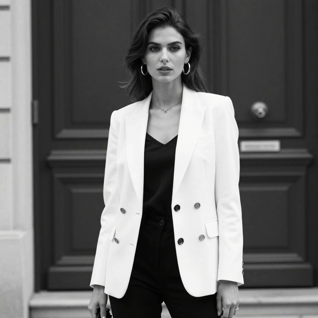 Photograph of a confident woman standing in front of a dark wooden door. She has dark, wavy hair and wears large hoop earrings, a black camisole, and a white, double-breasted blazer with black buttons. Her expression is serious, and she gazes directly at the camera. The blazer contrasts sharply with her black top and the dark background. The image is in black and white, emphasizing her outfit and the textures of the fabric. The door behind her has a round, metallic doorknob on the right. The overall style is modern and chic.